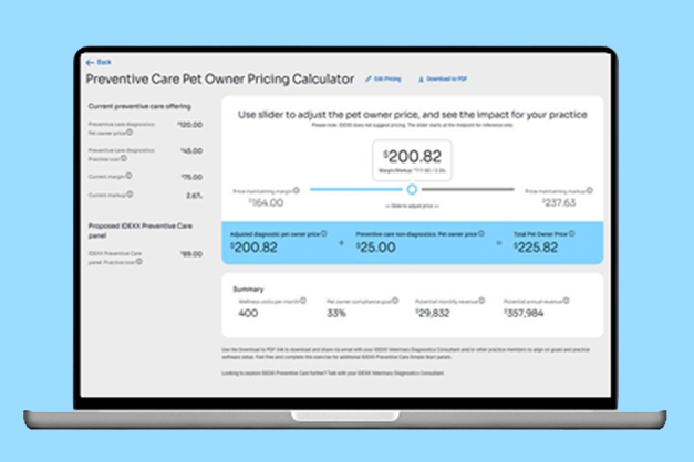 Assess pet owner pricing strategies to see the impact for your practice and pet owners. Can be used for full preventive care profiles including IDEXX Cancer Dx testing or specific to vector-borne disease, fecal, and/or SDMA testing.