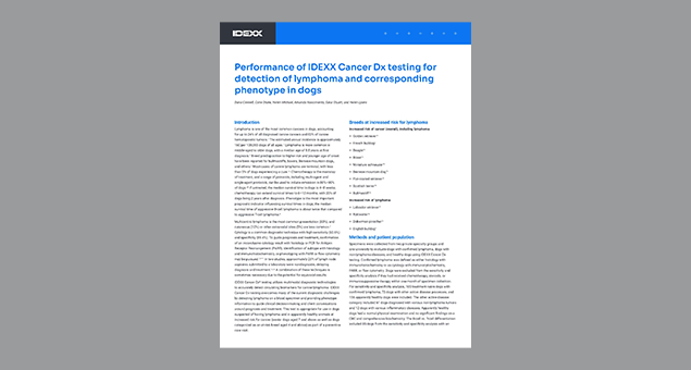 Our white paper gives you access to validation data about IDEXX Cancer Dx testing, including findings in dogs with confirmed lymphoma, healthy dogs, and those with other active diseases.