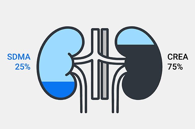 SDMA detects kidney issues when renal function has declined as little as 25%. Creatinine only detects kidney issues when renal decline has already reached 75%.1–3