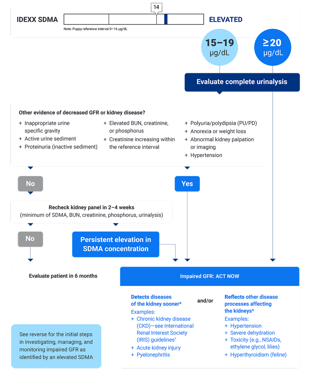 When SDMA result is ≥ 20 µg/dL, perform a complete urinalysis. Kidney disease is probable. Act immediately by following the protocol.